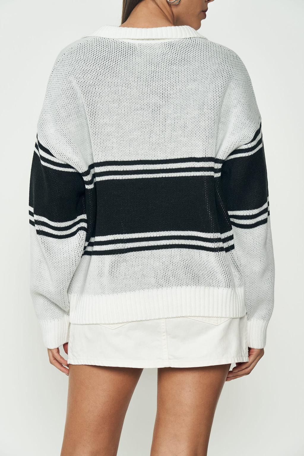 Suéter: Manga comprida, gola estilo polo, listras horizontais, logo Colcci aplicada, tecido macio e confortável.