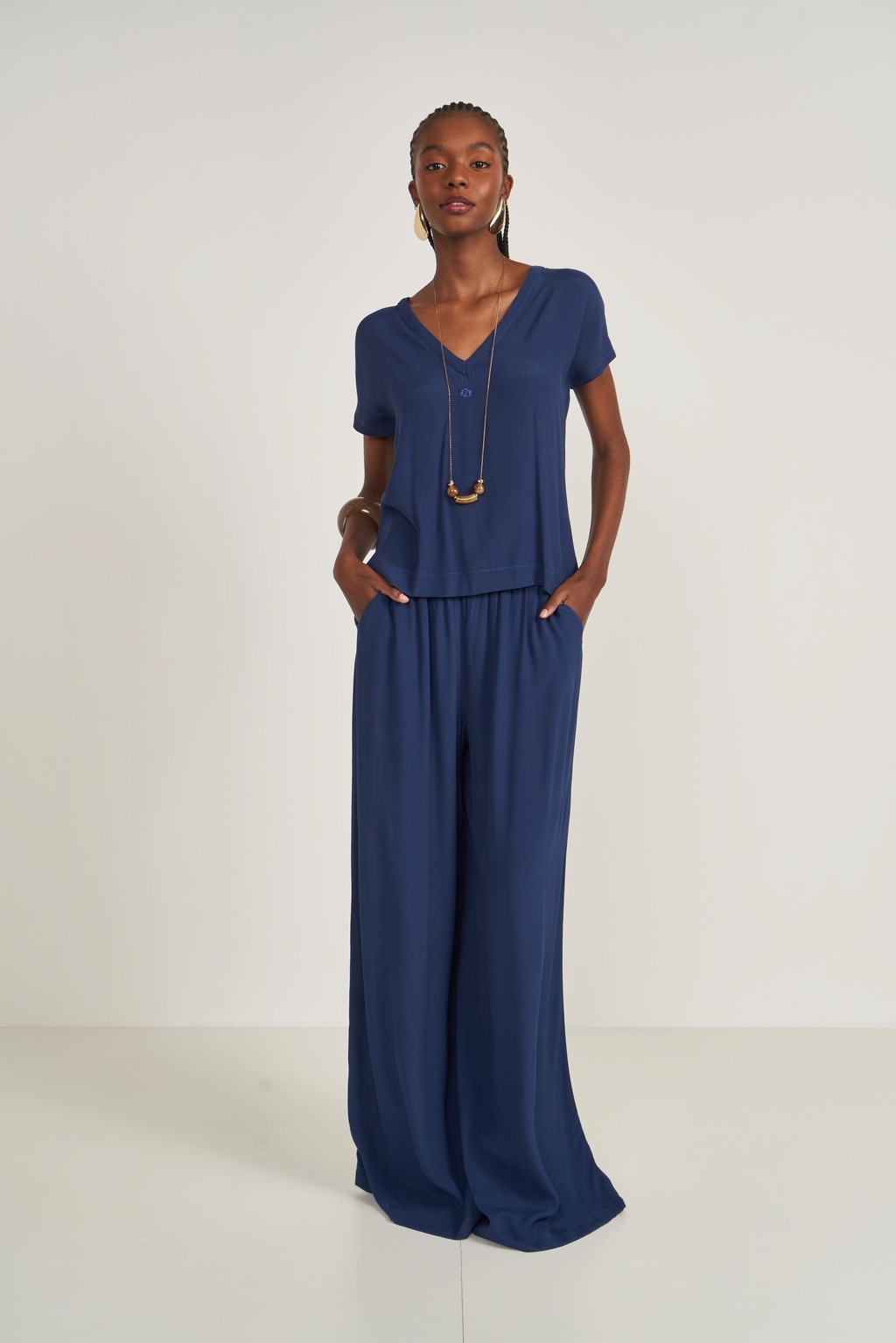 Design: Modelagem pantalona ampla e fluida, cintura alta com cós elástico franzido, bolsos faca laterais, e pernas largas.
