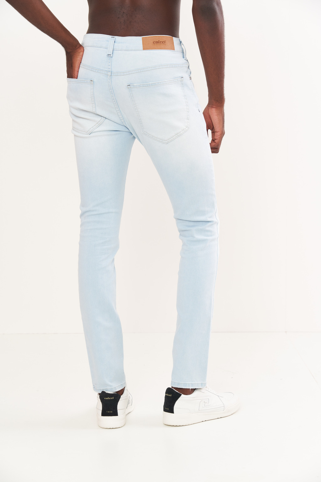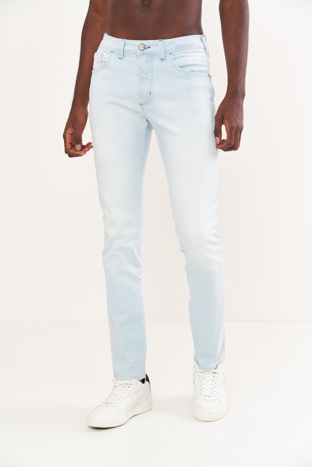 Design: Modelagem slim contemporânea (podendo ser ajustada para skinny dependendo do fit exato do modelo 'Felipe', mas 'slim' é uma descrição segura para a silhueta apresentada) que valoriza a silhueta masculina com um toque moderno. A lavagem em tom azul super claro, quase etéreo, confere um visual clean, luminoso e ideal para os dias de primavera, alinhado com a paleta suave e vibrante da coleção Riviera.