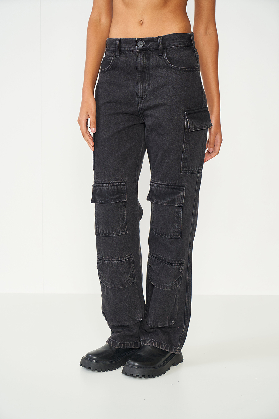 Calça tipo cargo apresenta shape low e modelagem leoni, cintura alta, cós com passantes e botão, braguilha com zíper, bolsos superiores, bolsos laterais e bolsos frente e barra com bainha.