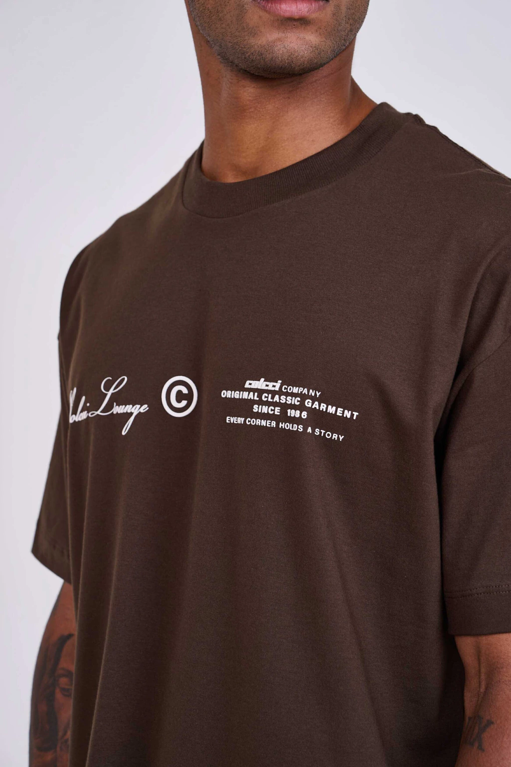 Detalhes: O grande destaque fica por conta da estampa frontal em branco. De um lado, 'Colcci Lounge' em uma tipografia manuscrita elegante, sugerindo relaxamento e exclusividade. Do outro, 'colcci COMPANY ORIGINAL CLASSIC GARMENT SINCE 1986 EVERY CORNER HOLDS A STORY' em tipografia serifada, reforçando a autenticidade e a história da marca. Estes detalhes inovadores conferem personalidade e um toque de originalidade à peça.