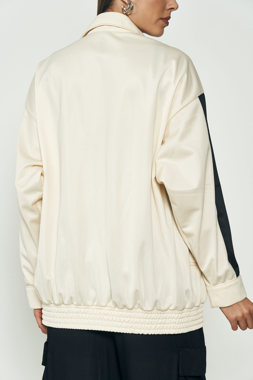 Jaqueta: Modelagem oversized, mangas longas com detalhe lateral em preto, fechamento frontal por botões de pressão, punhos e barra com elástico, bolso frontal. Aplicação de logo Colcci e escrita “Special” na parte frontal.