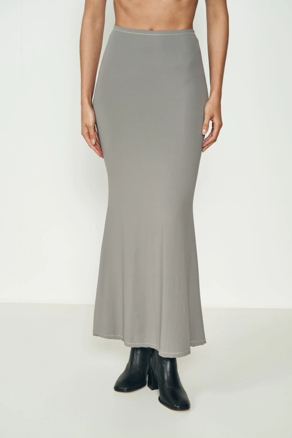 Saia: Modelagem slim, cintura alta, comprimento alongado, barra fluída com leve evasê.