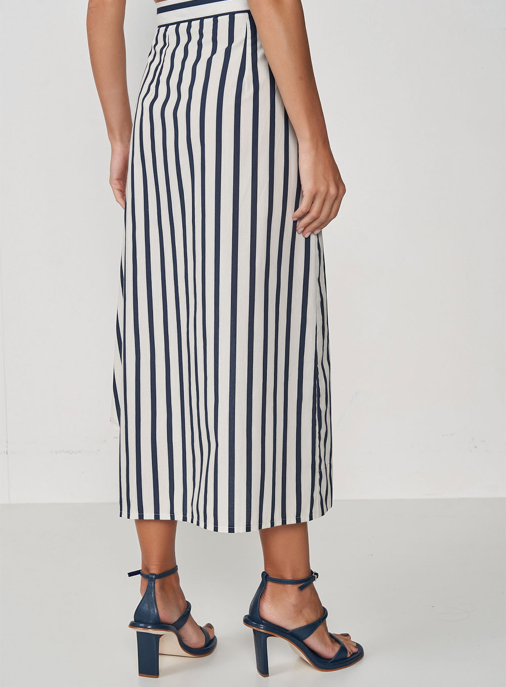 Saia: Modelagem envelope, comprimento midi, sobreposição assimétrica, estampada com listras.