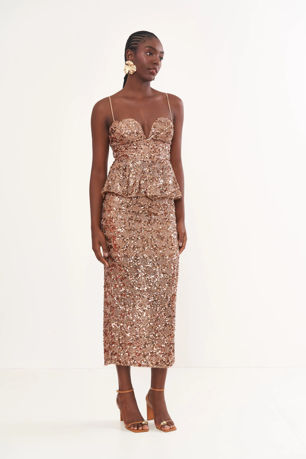 Design: Modelagem lápis com comprimento midi, que se ajusta elegantemente ao corpo. Possui cintura alta e uma fenda sutil na parte traseira, que garante conforto e fluidez ao caminhar. A peça é inteiramente bordada com paetês, criando uma superfície de brilho contínuo e luxuoso.