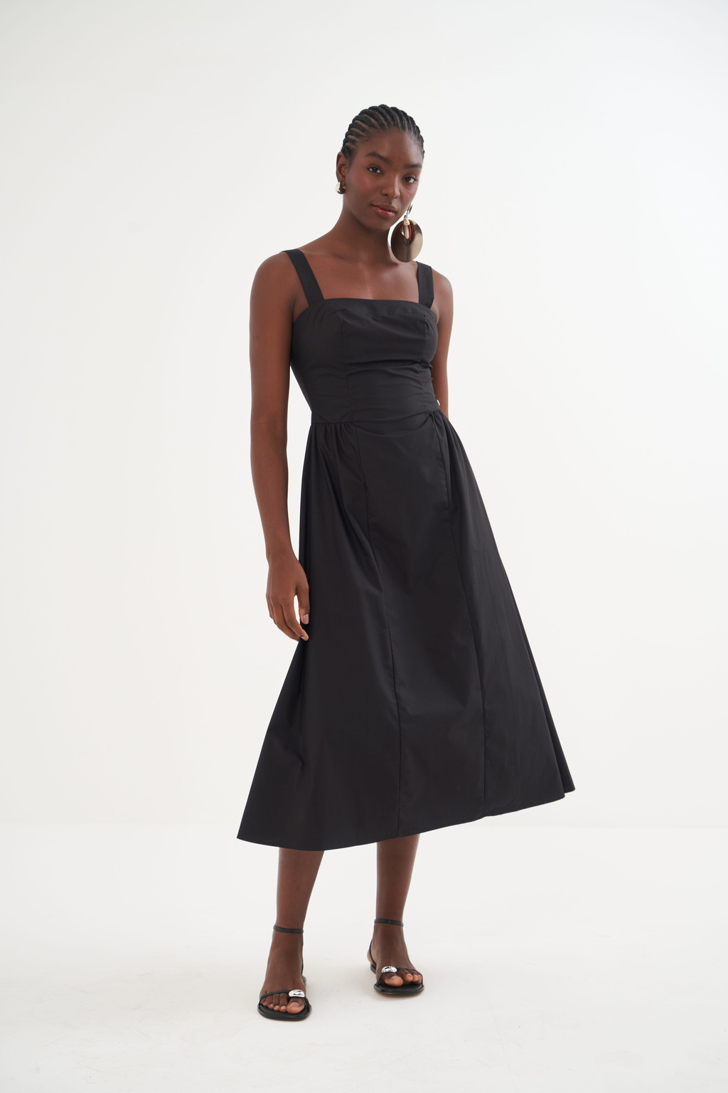 Design: Modelagem midi com corpete acinturado e saia evasê ampla, criando uma clássica silhueta 'fit and flare'. O design conta com decote quadrado e alças largas, que conferem conforto e sustentação.